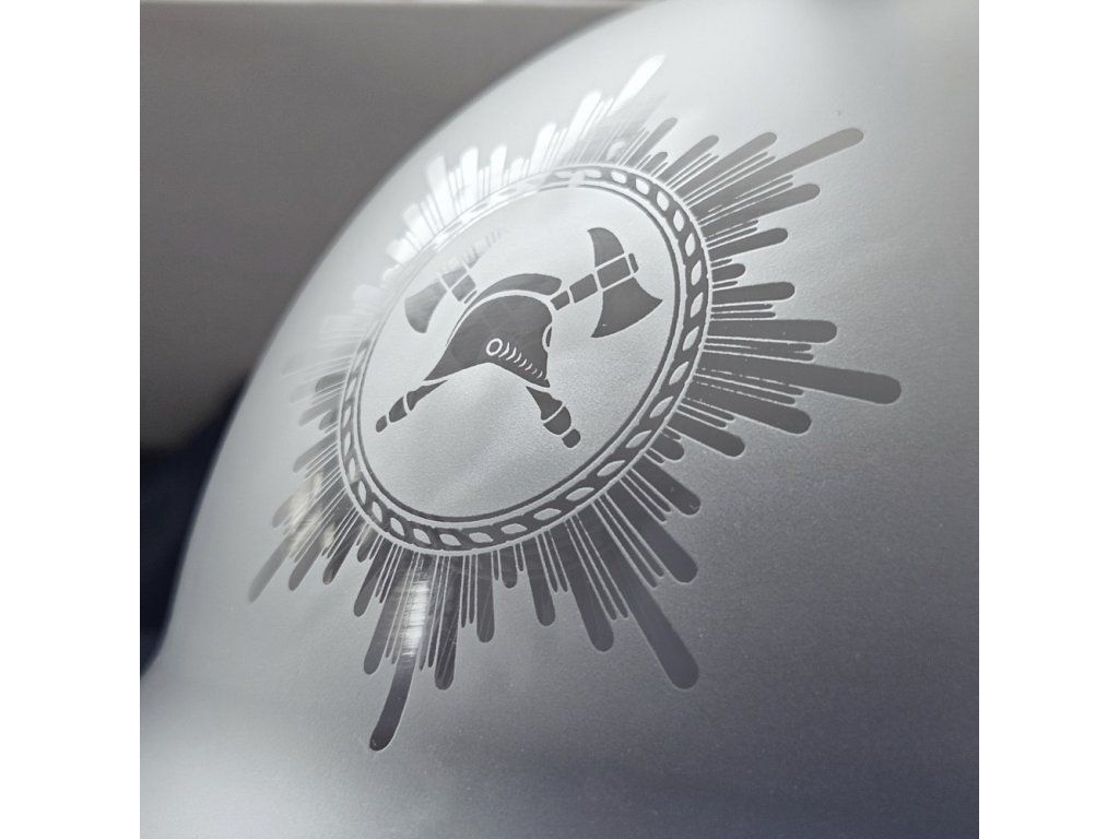 Technika pískování: Matný, pískovaný povrch dodává přilbě noblesní vzhled, nádherně láme světlo a dává vyniknout všem propracovaným detailům.