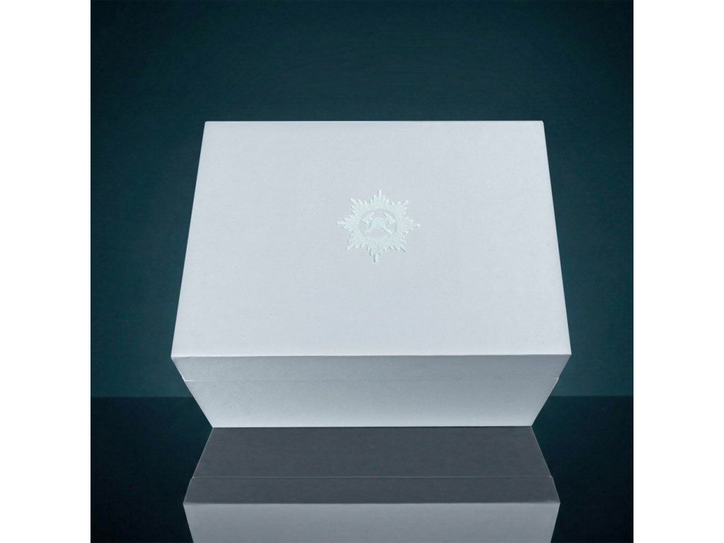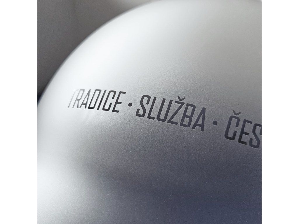 - Reprezentativní krabice: Bílá laminovaná kazeta zdobená ražbou hasičského symbolu (slepotisk). Uvnitř je přilba obklopena elegantním modrým saténem a fixována v pevné PU pěně, která zajišťuje 100% bezpečnost při přepravě. Krabici není třeba nijak dále upravovat či balit do papíru sama o sobě působí jako honosná součást ocenění.