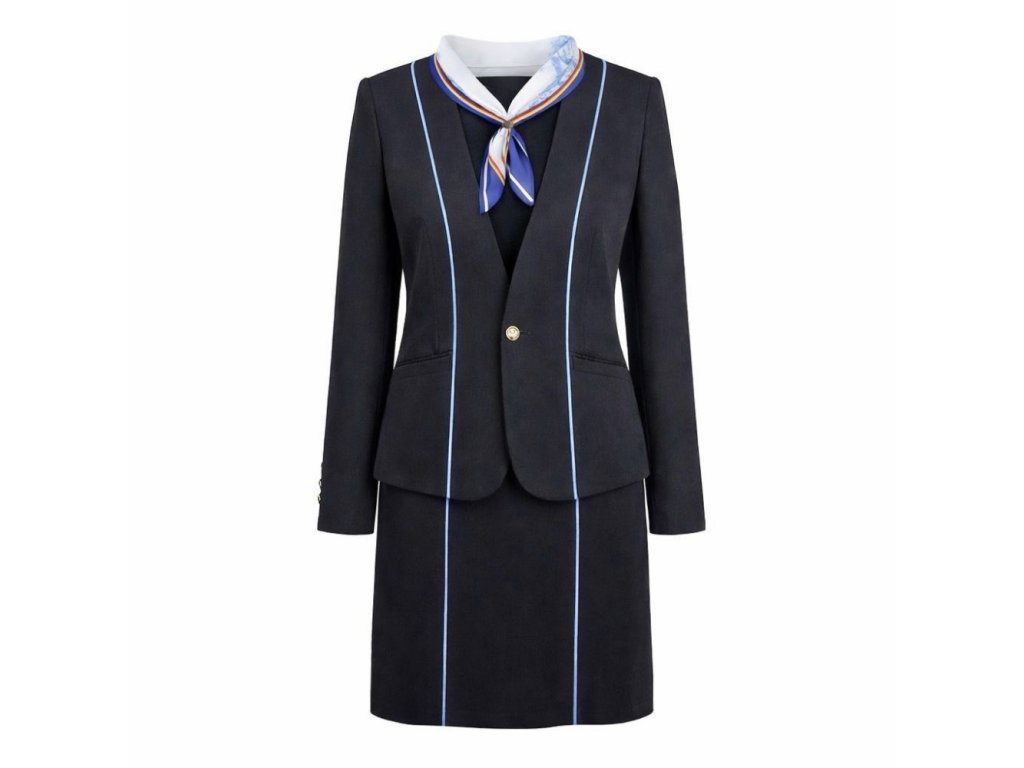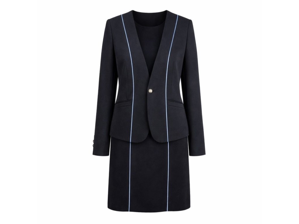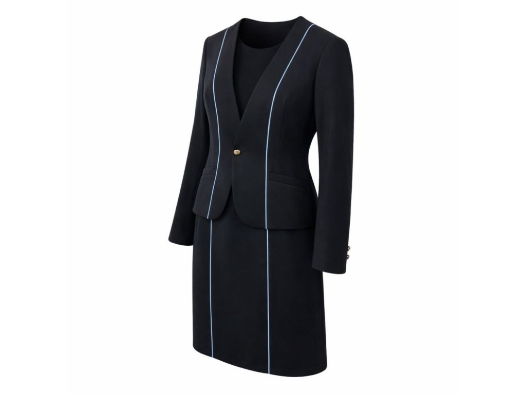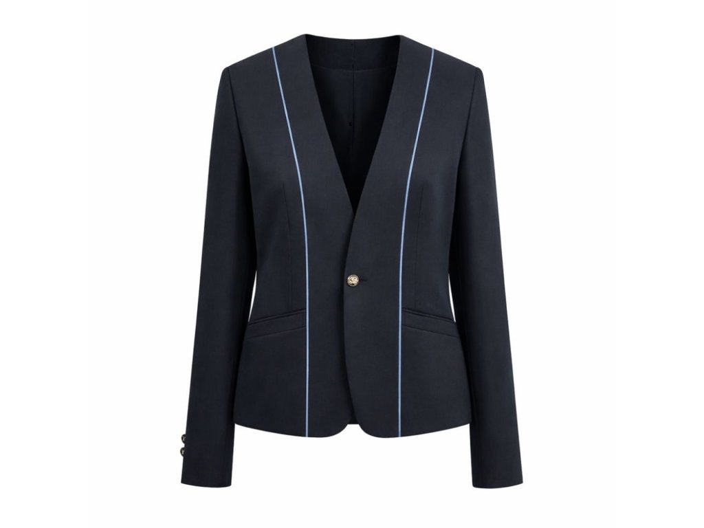 Elegantní dámské sako v tmavě modré barvě s jemným světle modrým lemováním, které dodává celkovému vzhledu nadčasovou a upravenou siluetu. Sako má otevřený výstřih bez klasických klop, jeden decentní zlatý knoflík pro zapnutí a hladkou podšívku pro pohodlné nošení. Na rukávu se nachází ozdobná nášivka, která modelu dodává stylový, lehce uniformní nádech. Skvěle doplní jednoduché šaty nebo elegantní outfit do společnosti. Součástí saka je zlatý rukávový znak SH ČMS.
