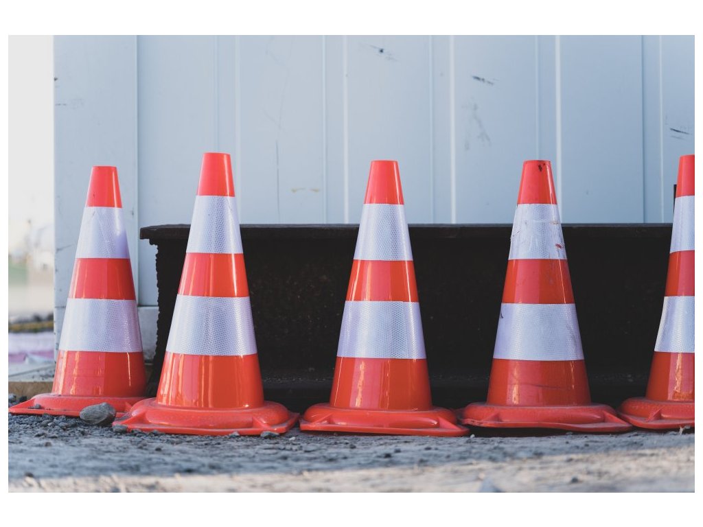 Výstražný dopravní kužel červený s bílými reflexními pruhy z PVC, se zvýšenou odolností proti nárazu a stlačení, který se nepoškodí ani přejetím.